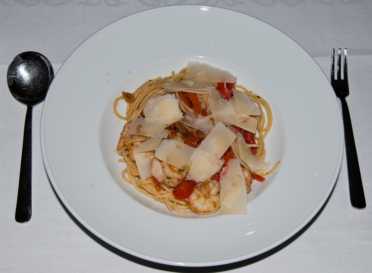 Das mit der Übersichtlichkeit täuscht, Ogro - was wahrscheinlich an der Dimension des Tellers liegt Der hat mit 30 cm Durchmesser echte Restaurantgröße und auf dem Teller liegen über 120 g Nudeln, 1,5 Paprikaschoten und 10 Garnelen. Das reicht dann auch für den größeren Hunger